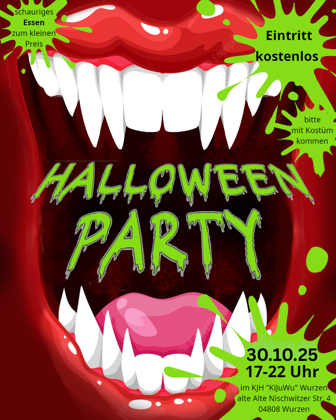 Herzliche Einladung zur Halloween-Party im Kinder- und Jugendhaus Wurzen. Der Eintritt ist kostenfrei, Essen und Trinken gibt es zum kleinen Preis, aber ein Kostüm wird erwartet.